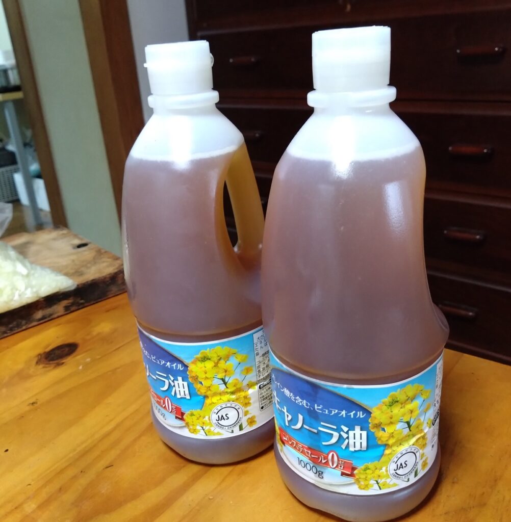 サラダ油のボトルに詰まったオイルは、キッチン華で使用済みの油です。一日で出る油の量です。